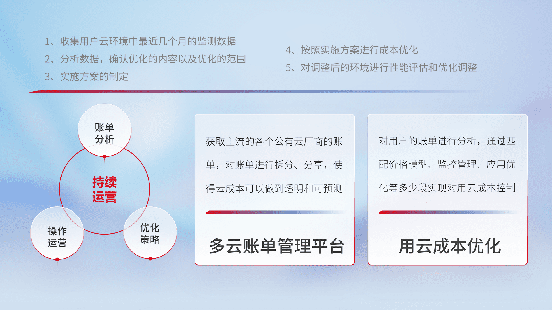 通过多云纳管,,以统一的资源数据模型把客户的云资源进行抽象和封装,,进而实现对多云资源的统一操作,,,保障云资源管理的可靠性、、、、稳定性与可用性。。。量身定制化运维内容,,,配置、、开发运维、、、补丁管理、、、、备份、、、、监控、、、认证和访问管理、、、、审计和日常巡检等,,,,保障在用云过程中的可靠度,,,稳定度以及高可用率。。