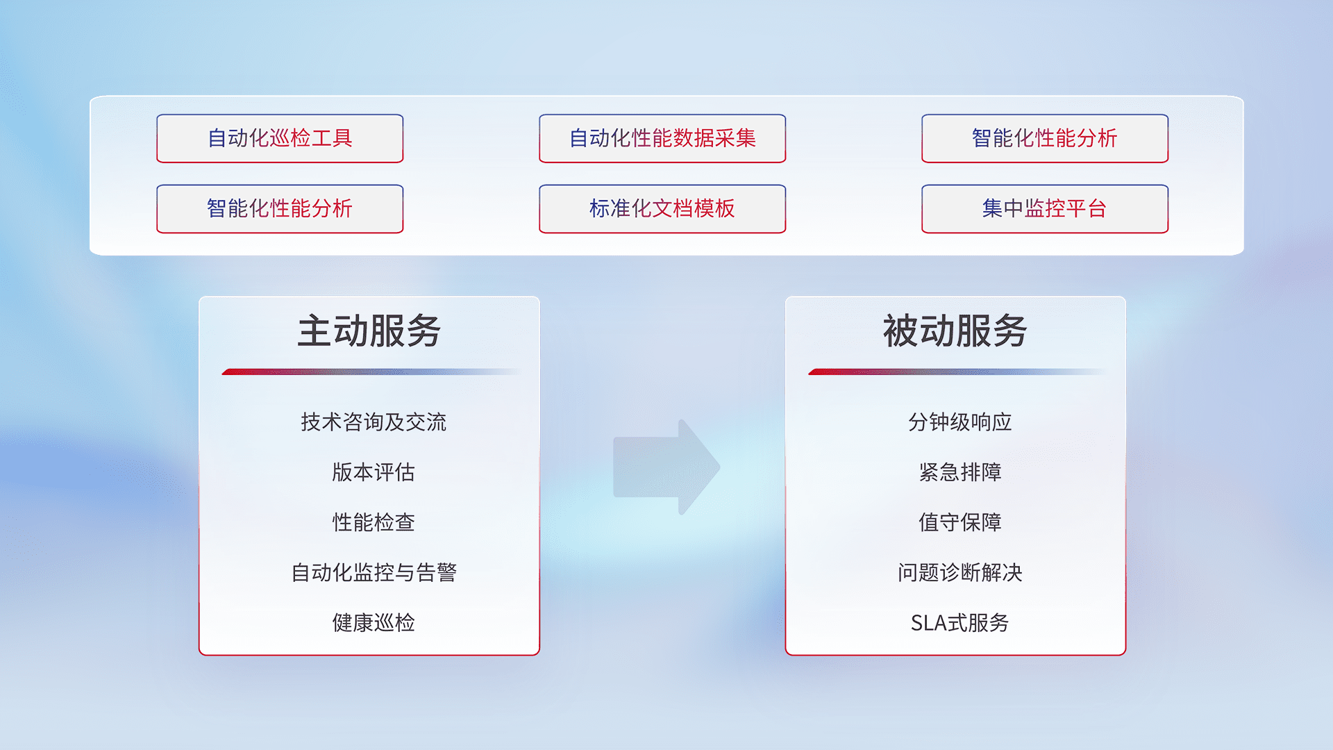 智能化工具和标准化文档,,保障服务质量,,,提供主动服务(包含技术咨询、、、、版本评估、、性能检查、、、、自动化监控与告警、、健康巡检)和被动服务包含(分钟级响应、、、紧急排障、、、、值守保障、、、问题诊断解决、、、、SLA服务)。。。