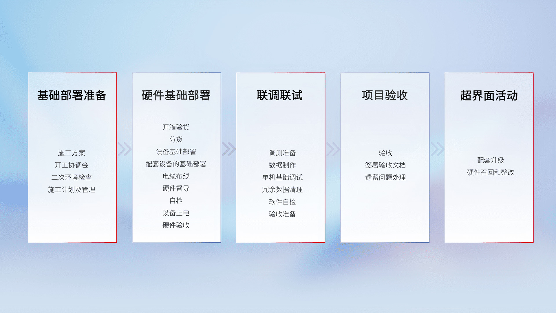 从基础部署准备、、硬件基础部署、、联调联试、、、项目验收、、越界面活动的全过程可追溯,,,,保证施工质量和进度。。。。
